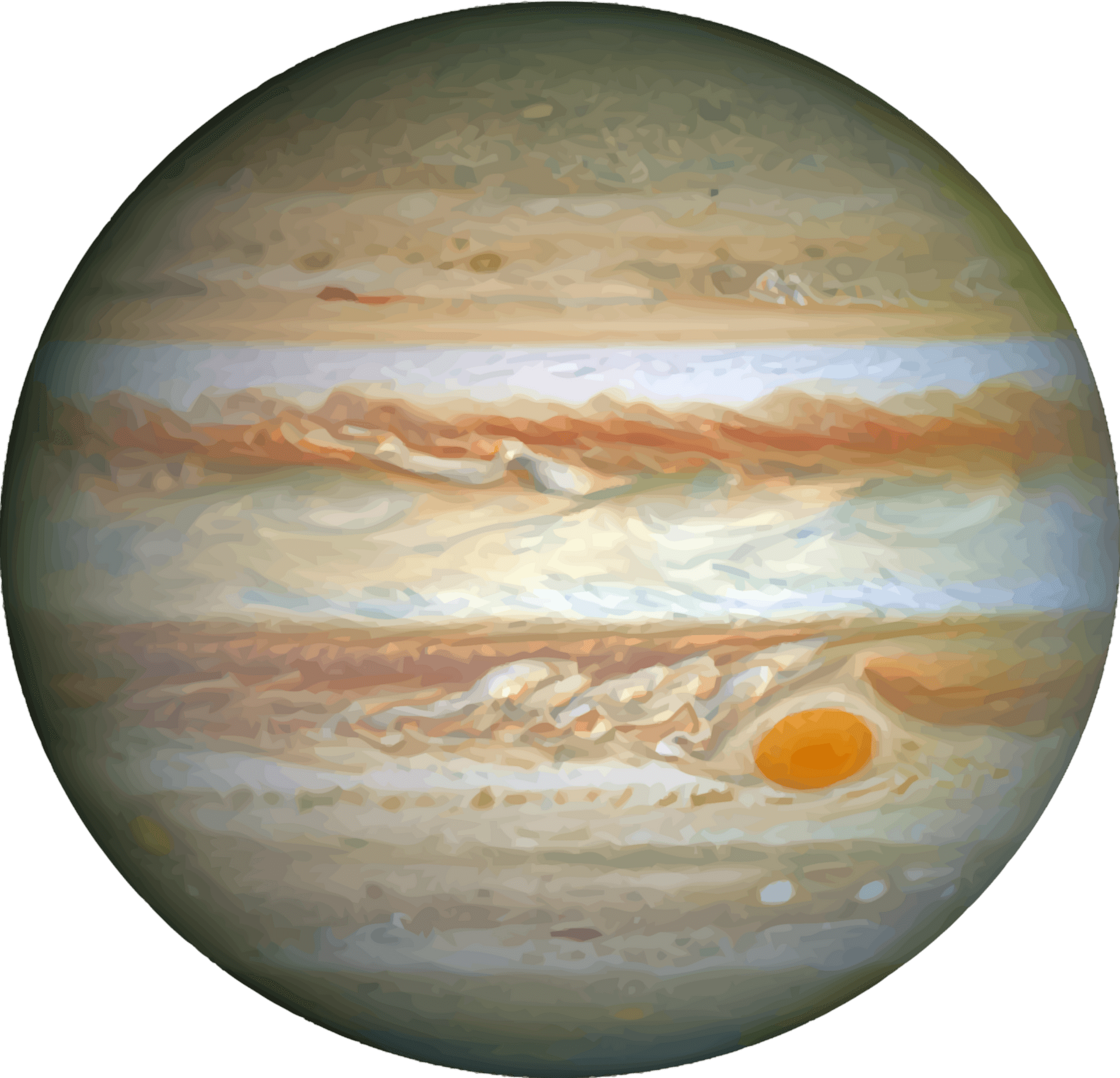 Júpiter é o gigante do Sistema Solar — seu diâmetro é 11 vezes maior que o da Terra e sua massa equivale a 2,5 vezes a soma de todos os outros planetas. É composto principalmente por hidrogênio e hélio, e não possui uma superfície sólida definida. Em sua atmosfera turbulenta, acontecem tempestades colossais, como a Grande Mancha Vermelha, uma tempestade que existe há pelo menos 300 anos. Júpiter tem mais de 90 luas conhecidas, incluindo Ganimedes, a maior de todas, maior até que o planeta Mercúrio. Sua força gravitacional ajuda a proteger os planetas internos, desviando asteroides e cometas.